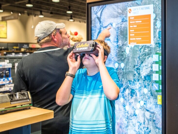 Dimensional Innovations partnered with Cabela’s—a large retail store focused on hunting, fishing, camping, and outdoor gear—for the opening of their two newest locations in Albuquerque, New Mexico and El Paso, Texas. With the new locations having significantly smaller square footage, Cabela’s needed a retail-focused solution that would still be high impact, all without taking up valuable floor real-estate. DI outfitted each store with three interactive “Trailhead” kiosks—one Trailhead per section: Camping, Hunting, and Fishing—and three Virtual Reality (VR) headsets to pair with the kiosks. In an effort to better assist every customer, these Trailheads would enable every store associate to be an expert on products and outdoor activities.